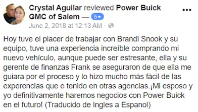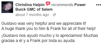 Aquà en Power Buick GMC orgullosamente servimos a la comunidad Latina de Salem y sus alrededores. Siempre ofrecemos los mejores precios, financiamiento, y servicio.Â